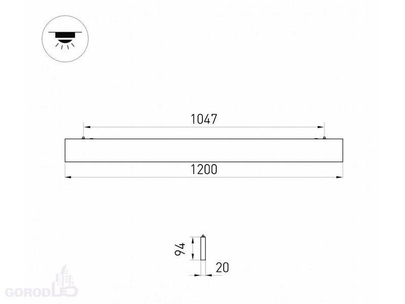 Размер: (LxWxH) 1200 x 20 x 94 мм. Длина подвеса 500-1500 мм. Питание AC 220-240V, 40 Вт, драйвер встроенный (DC1000mA, 33-40V).