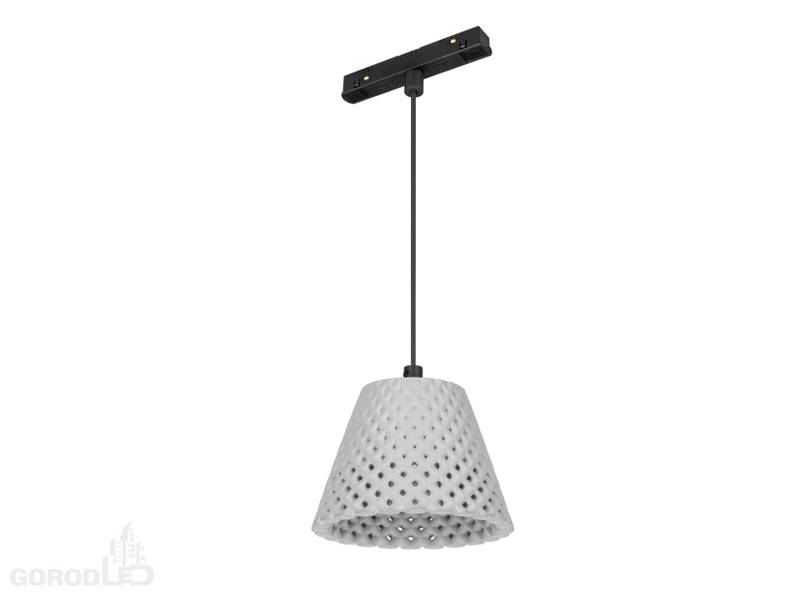 Светильник для магнитных треков MAG-ORIENT шириной 26 мм. Мощность 5 Вт, св. поток 120 лм, Дневной белый 4000 K, Теплый белый 3000К, CRI>90, угол 80°, напряжение питания 48 В. Серый фигурный корпус из композитного материала на основе гипса , степень защиты IP20. Размер светоизлучающего модуля: 135*100 мм. Длина подвеса 1500мм. Монтаж на трек MAG-ORIENT.