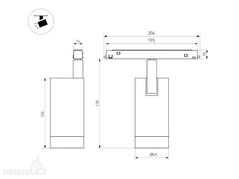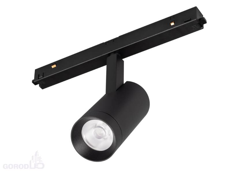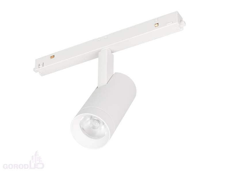 Светильник для магнитных треков MAG-ORIENT шириной 26 мм. Мощность 9 Вт, св. поток 820 лм, 91 лм/Вт, теплый 3000 K, дневной 4000 К, ультратеплый 2700 К, CRI>90, угол 24°, напряжение питания 48 В. Белый или черный фигурный корпус из металл, экран поликарбонат, степень защиты IP20. Размеры LxWxH 204x45x146 мм. Длина светоизлучающего модуля 100мм. Монтаж на трек MAG-ORIENT. Пульсация <1%.