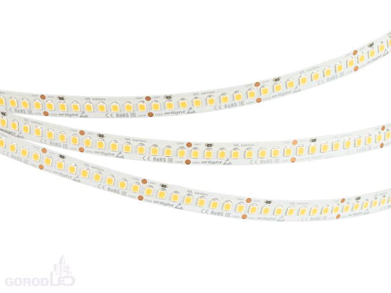 Светодиодная гибкая лента серии UL. Светодиоды 2835, 200 шт/м (1000 шт на 5 м). Белая плата 10 мм, скотч 3M. Цвет ультратеплый 2400 K, теплый белый 3500 К, CRI> 90, угол рассеивания 120°. Напряжение питания 24 В, мощность 20 Вт/м (100 Вт на 5 м). Размеры 5000x10x1.5 мм. Мин.отрезок 40 мм (8 светодиодов). Цена за 1 м.