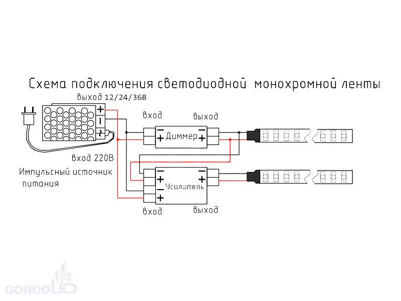 Работа ленты обеспечивается подключением к сети постоянного напряжения 12V DC, которое способны выдавать импульсные источники питания. Для стабильной работы светодиодной ленты необходимо подбирать блок питания с запасом мощности +25 %. Так, для 5 метров ленты SMD3014 240 led потребуется блок питания мощностью 150 Вт