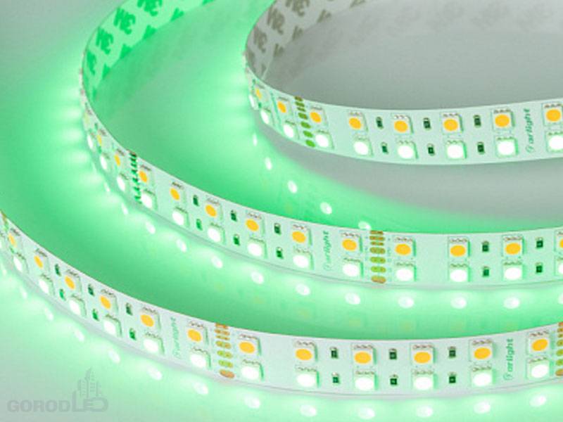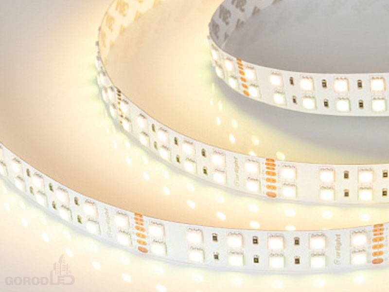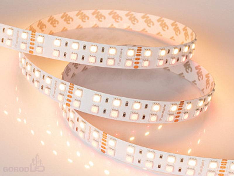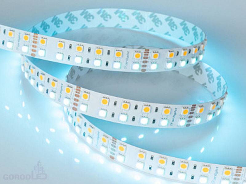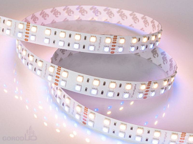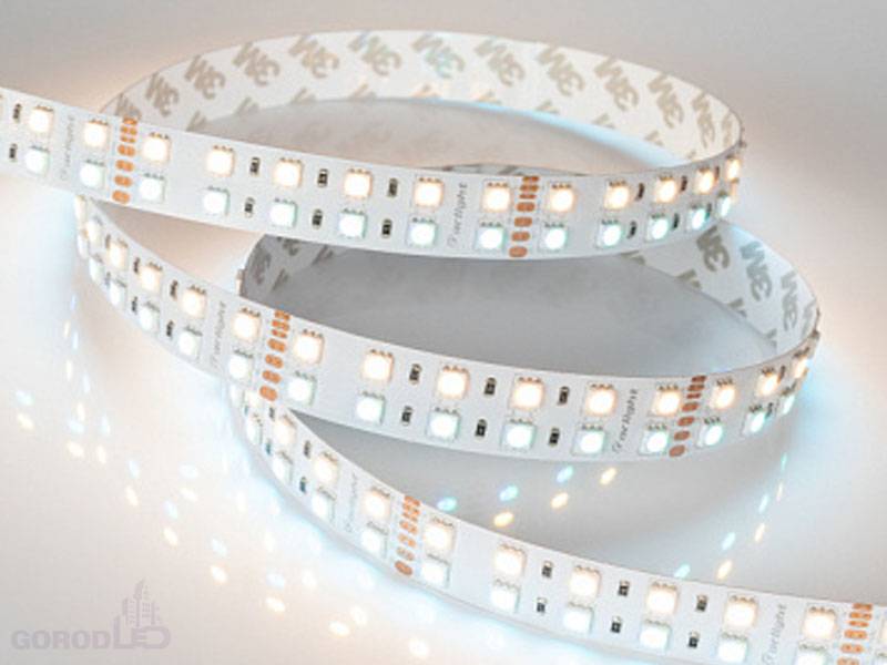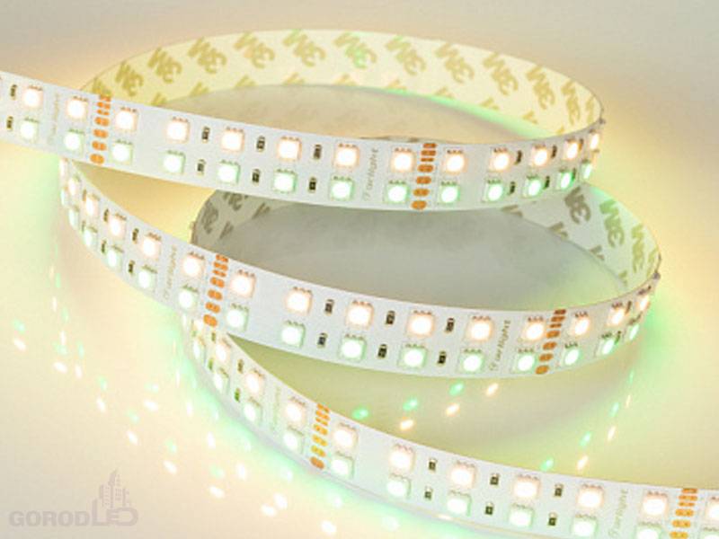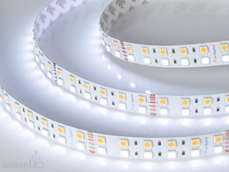 Лента потребляет высокую мощность, поэтому требуется установка ленты на дополнительный теплоотвод, например алюминиевый профиль. Это необходимое условие для сохранения длительного срока службы. Лента с 2 рядами белых и RGB-светодиодов. Белое свечение может быть основным или дополнять цветное для создания пастельных тонов. RGBW - 4 канальная лента, 5 проводов для подключения, цвет меняется при смене каналов. Белое свечение и до 65млн насыщенных цветов. Управляется любым RGBW контроллером, напр. SMART-K14-MULTI (023822). Оформление больших клубов, залов, ресторанов. Лента потребляет высокую мощность, поэтому требуется установка ленты на дополнительный теплоотвод, например алюминиевый профиль. Это необходимое условие для сохранения длительного срока службы.Светодиодная двухрядная лента класса LUX, максимальной плотности 720 диодов на метр. Гибкая плата белого цвета, на двухстороннем скотче 3М. Светодиоды smd 5060 максимальной яркости, угол 120°. Срок службы более 50 000 часов, при соблюдении правил монтажа и эксплуатации.
