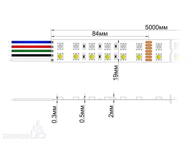 Варианты свечения: RGB + холодный белый, RGB + нейтральный белый, RGB + теплый белый. Длина 5м, на катушке; Мощность R/G/B 5.4 Вт/м на канал, White-канал 16 Вт/м. Общая мощность 160 Вт. Разрезается, минимальный отрезок 84 мм, 12 светодиодов; Провода для подключения с каждой стороны; Подключайте только к стабилизированным источникам напряжения 24 В.