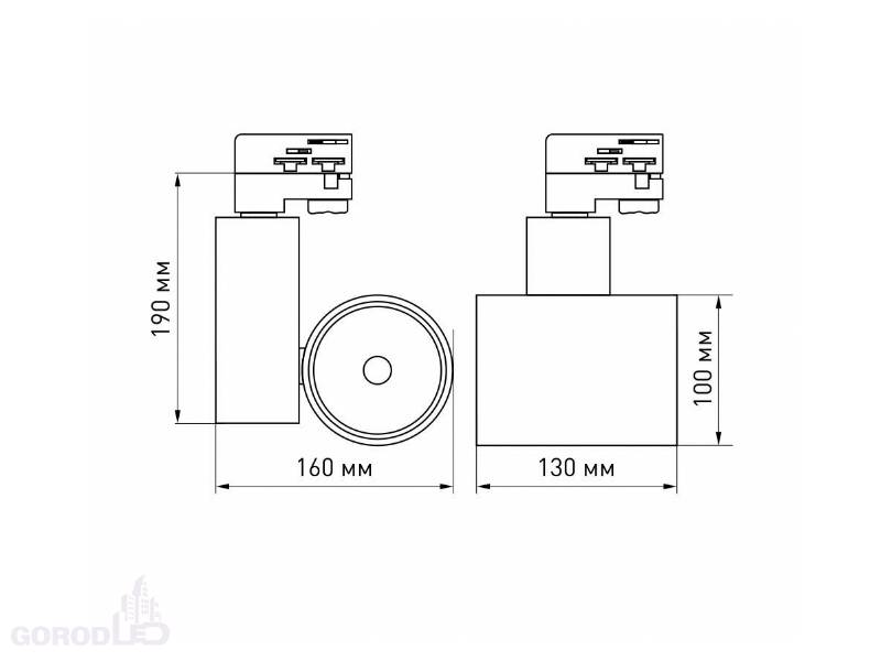 Размер: диаметр 100 мм, высота 190 мм. Монтаж на трек 3-фазный. Драйвер 30-42 В, 1000 мА, пульсация <1%.
