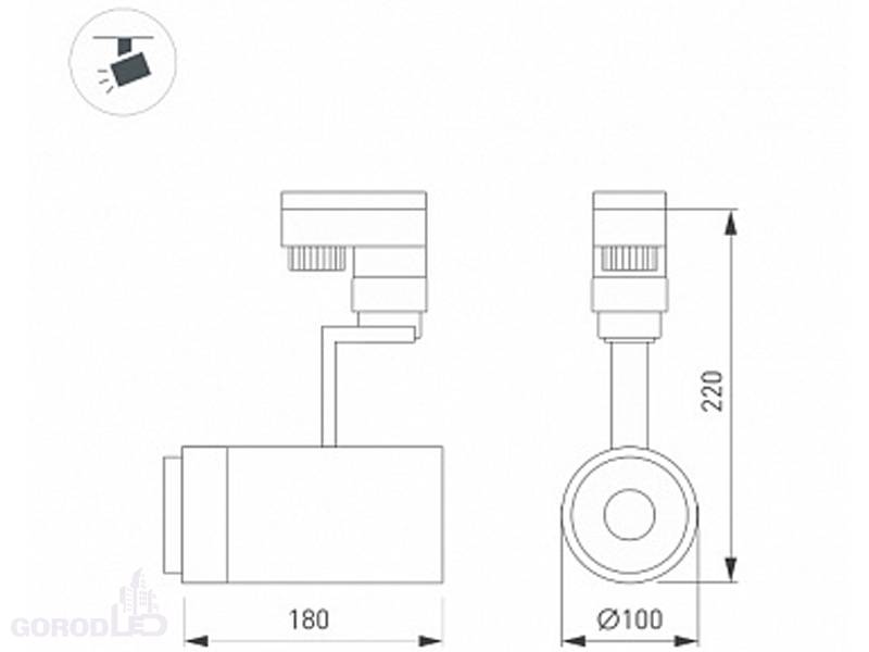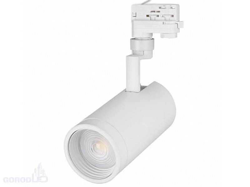 Световой поток 2400-3000 лм, регулируемый угол 20-60°, CRI>90. Корпус круглый, металл, цвет белый, IP20. Размеры: (DxHxL) Ø100 x 220 x 180 мм.