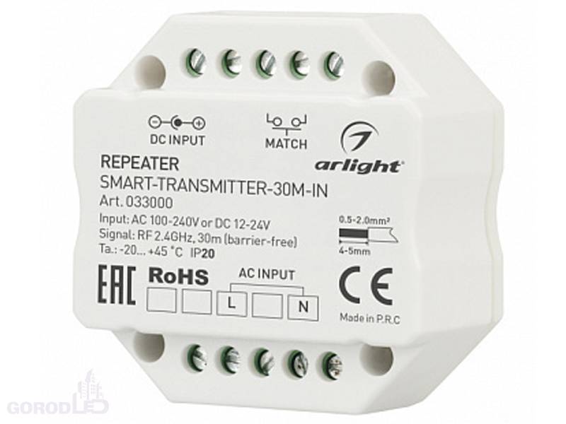 Беспроводной приёмо-передатчик радиосигнала 2.4 G для расширения дальности приема сигнала диммеров и контроллеров серии SMART. Установка в подрозетник. Напряжение питания AC 100-240 V и DC 12-24 V, потребляемая мощность не более 0.6 Вт (AC) и 0.4 Вт (DC), частота радиосигнала 2400 Гц, дальность приема сигнала до 30 метров. Габариты 52 х 52 х 26 мм.