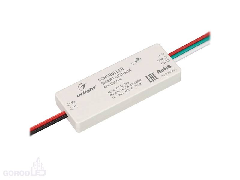 Контроллер для мультибелой (MIX) светодиодной ленты (ШИМ). Питание/рабочее напряжение 12-24VDC, максимальный ток 2.5 A на канал, 2 канала, максимальная мощность 60-120 W. Корпус - PVC. Габариты 64 x 23.5 x 8.5 мм. Управляется пультами и панелями серии SMART (поставляются отдельно).