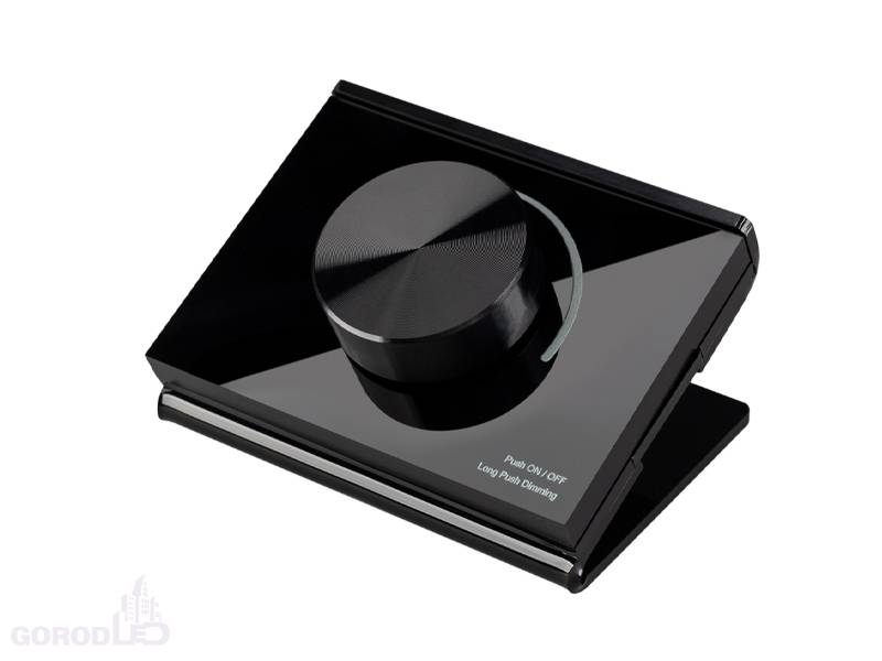 Настольная роторная стеклянная панель 2.4 ГГц, цвет чёрный. Для управления одноцветными источниками света (ШИМ). Управление яркостью с помощью роторного регулятора. Питание/рабочее напряжение 3 VDC от батарейки CR 2032. Габариты 91 х 72 х 52 мм. Панель совместима с диммерами и пультами серии SMART.
