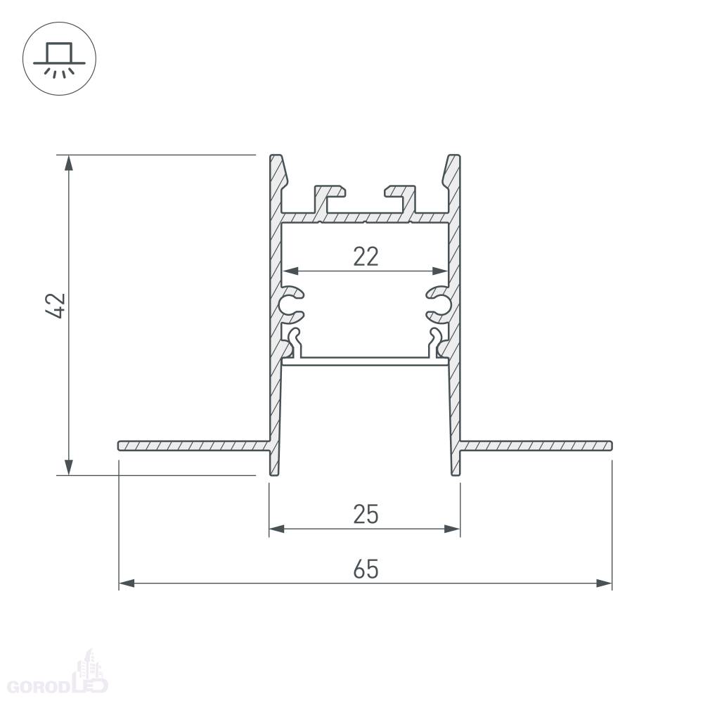 Габаритные размеры (L×W×H): 2000 x 65 x 42 мм, паз для установки 25 мм. Ширина площадки для ленты 22 мм.