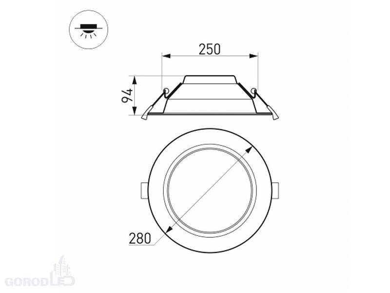 Встраиваемый светильник "Даунлайт" 40Вт. Цвет свечения холодный белый 6000К, дневной белый 4000К, теплый белый 3000К. Световой поток холодный белый 3880лм, дневной белый 3880 лм, теплый белый 3600 лм, угол 90°, CRI>80. Белый корпус. Питание AC220-240V. Габариты: Ø280х94мм, врезное отверстие Ø240-255мм. Драйвер в комплекте (23-38.5V, 1050mA).