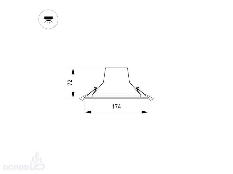 Светильник с высокой светоотдачей, световым потоком 2000 лм и углом излучения 80° обеспечивает равномерное освещение без мерцания и видимости точек светодиодов. Светильник встраивается в установочное отверстие Ø145–155 мм с помощью удобных креплений.
