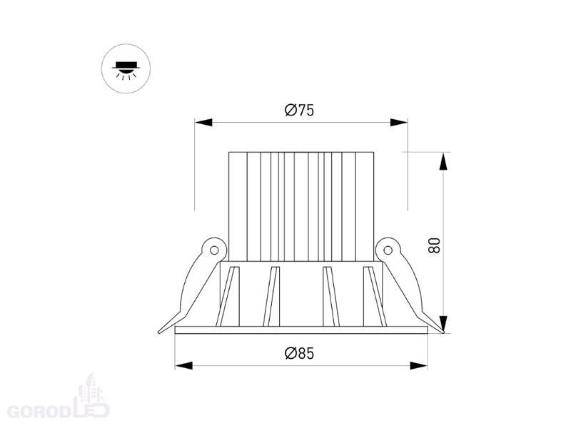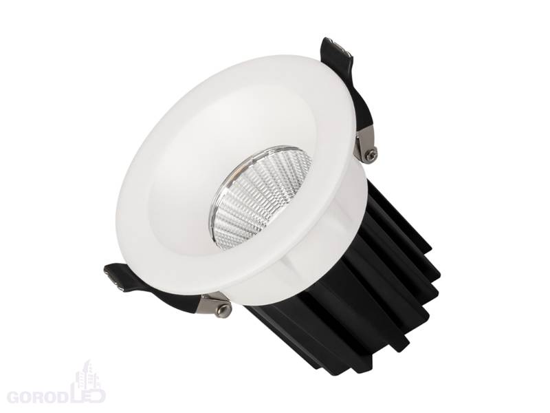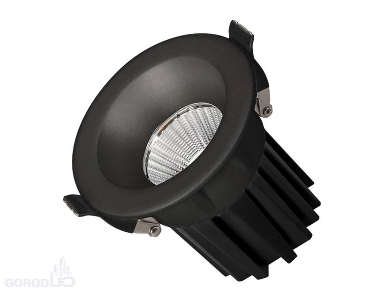 Встраиваемый светильник даунлайт. Мощность 10 Вт, св. поток 750 лм, 75 лм/Вт, теплый 3000 K, CRI>90, угол 60°, напряжение питания 230 В. Черный или белый круглый корпус из алюминия, экран PMMA, степень защиты IP54. Размер: диаметр 85 мм, высота 80 мм. Монтаж встраиваемый, установочное отверстие: диаметр 75 мм. Драйвер В, 20-40 В, 250 мА, пульсация <5%.