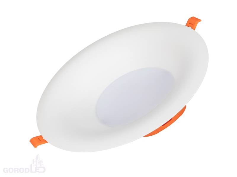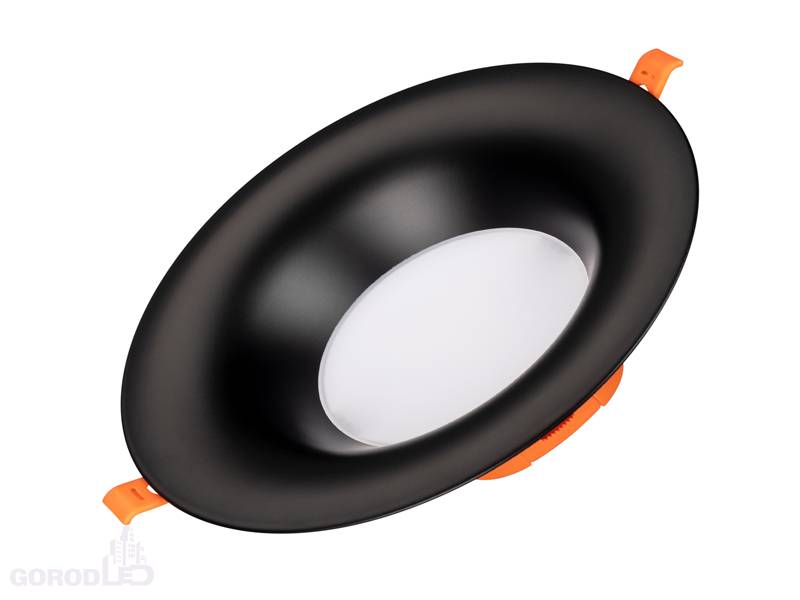 Встраиваемый светильник даунлайт. Мощность 20 Вт, св. поток 1790 лм, 90 лм/Вт, теплый 3000 K, дневной 4000 К, CRI>90, угол 100°, напряжение питания 230 В. Белый или черный круглый корпус из алюминия, степень защиты IP20. Размер: диаметр 215 мм, высота 90 мм. Монтаж встраиваемый, установочное отверстие: диаметр 200 мм. Пульсация <2%.