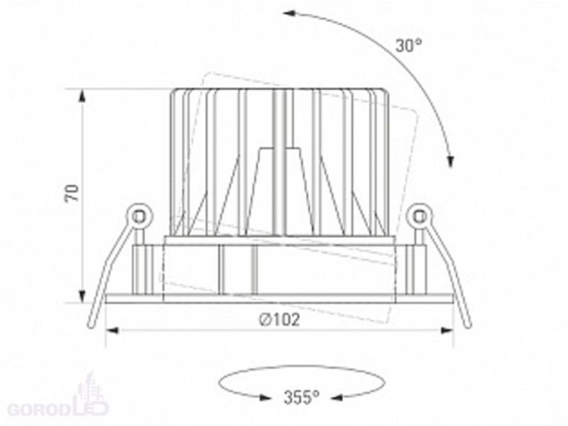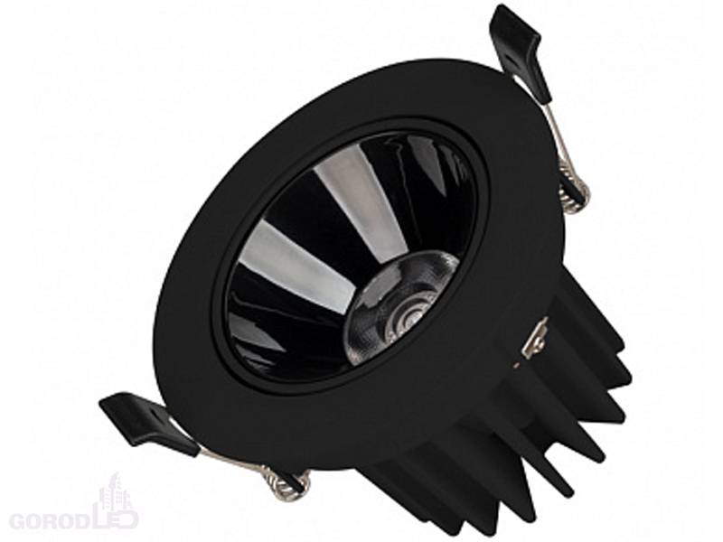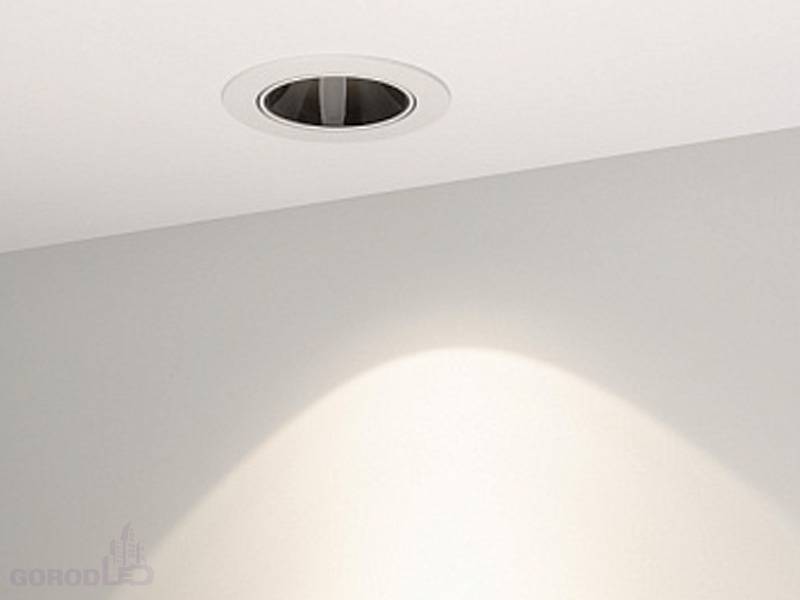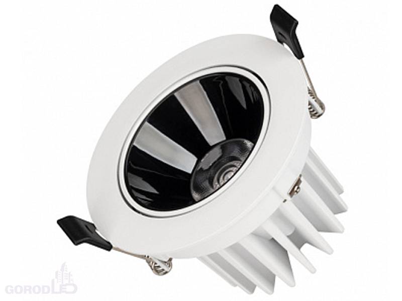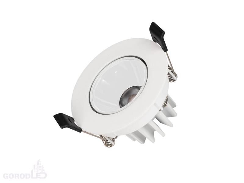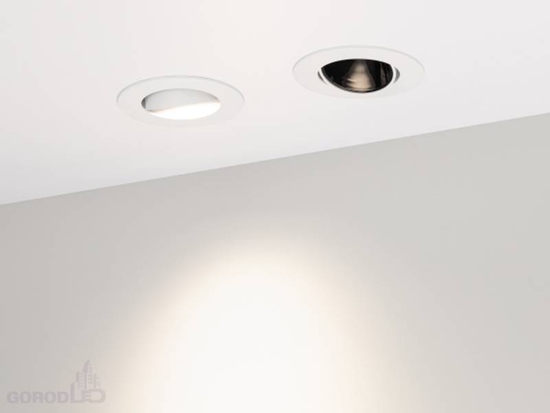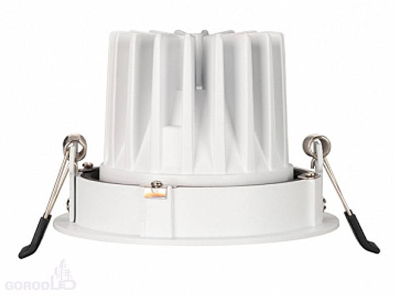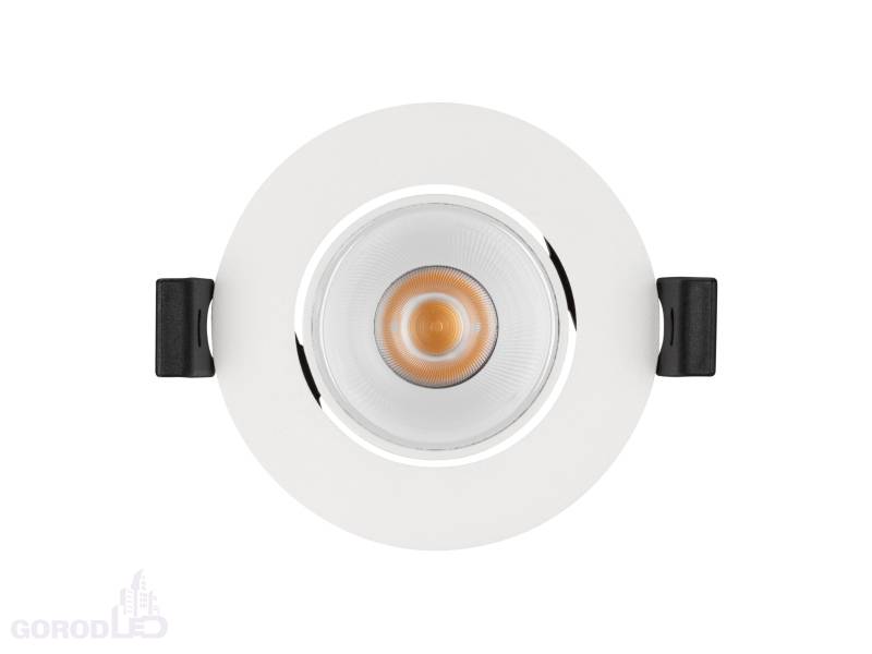 Встраиваемый поворотный светильник даунлайт. Мощность 12 Вт,св. поток 970 лм, 81 лм/Вт, дневной белый 4000 K; теплый белый 3000 К, CRI>90, UGR<18, угол 32°, напряжение питания 230 В.