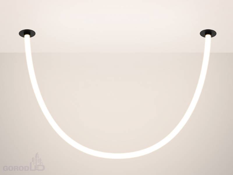 Подвесной светильник. Мощность 18 Вт, св. поток 980 лм, 54 лм/Вт, теплый 3000 K, дневной 4000 К, CRI>90, угол 360°, напряжение питания 230 В. Черный круглый корпус из стали, силиконовая герметичная лента, степень защиты IP20. Размер: диаметр утапливаемой части чаши 64 мм, высота чаши с утапливаемой частью без вывода под неон 40 мм, общая высота чаши 57 мм, диаметр чаши с фланцем 100 мм, диаметр силиконовой герметичной ленты 18 мм, длина силиконовой герметичной ленты 1200 мм. Монтаж встраиваемый, глубина установки 55 мм, диаметр установочного отверстия 70 мм. Блок питания 24 В, 750 мА, пульсация <1%.