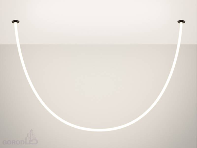 Подвесной светильник. Мощность 36 Вт, св. поток 2300 лм, 63 лм/Вт, дневной 4000 K, теплый 3000 К, CRI>90, угол 360°, напряжение питания 230 В. Черный круглый корпус из стали, силиконовая герметичная лента, степень защиты IP20. Размер: диаметр утапливаемой части чаши 64 мм, высота чаши с утапливаемой частью без вывода под неон 40 мм, общая высота чаши 57 мм, диаметр чаши с фланцем 100 мм, диаметр силиконовой герметичной ленты 18 мм, длина силиконовой герметичной ленты 2500 мм. Монтаж встраиваемый, глубина установки 55 мм, диаметр установочного отверстия 70 мм. Блок питания 24 В, 1880 мА, пульсация <5%.