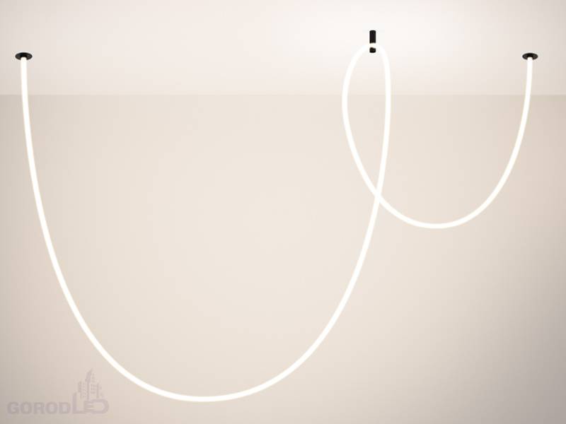 Подвесной светильник. Мощность 58 Вт, св. поток 3260 лм, 56 лм/Вт, теплый 3000 K, дневной 4000 К, CRI>90, угол 360°, напряжение питания 230 В. Черный круглый корпус из стали, силиконовая герметичная лента, степень защиты IP20. Размер: диаметр утапливаемой части чаши 64 мм, высота чаши с утапливаемой частью без вывода под неон 40 мм, общая высота чаши 57 мм, диаметр чаши с фланцем 100 мм, диаметр силиконовой герметичной ленты 18 мм, длина силиконовой герметичной ленты 5000 мм. Монтаж встраиваемый, глубина установки 55 мм, диаметр установочного отверстия 70 мм. Блок питания 24 В, 2500 мА, пульсация <5%.