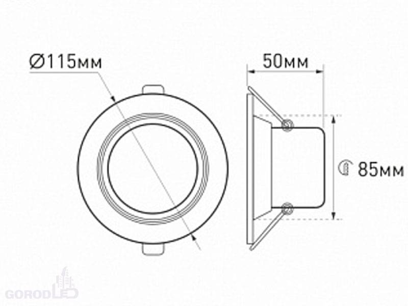 Встраиваемый круглый светильник 9Вт. . Алюминиевый белый корпус. Световой поток 720лм, угол 120°. Питание 110-240V/AC, драйвер в комплекте. Размеры DxH: 115x50мм, отверстие для установки 85мм.