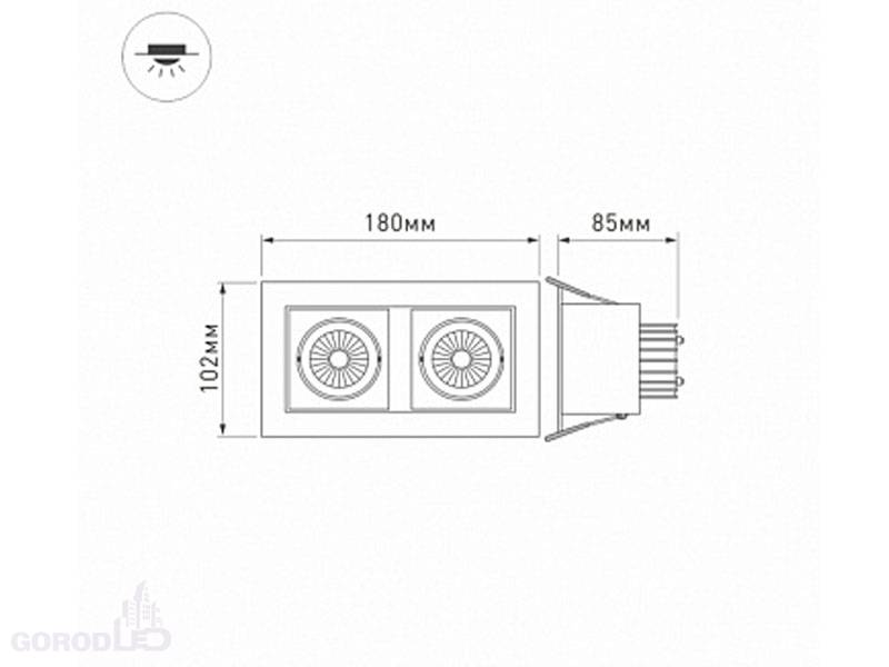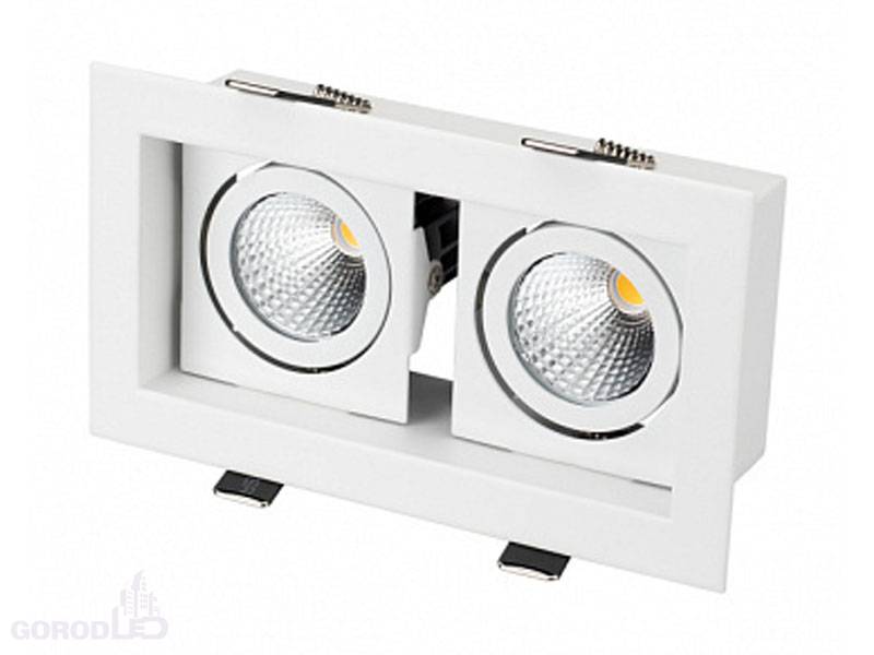 Встраиваемый карданный светильник. Угол 38° / 2x9Вт / 1440лм, CRI>80. Корпус из белого алюминия. Питание AC180-240V, 18Вт, в комплекте 2 драйвера 200mA 30-45V. Размеры LxWxH: 180х102x85мм, отверстие для установки 160x85мм.