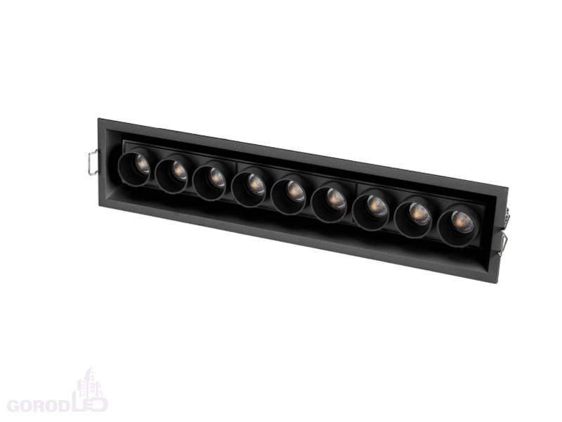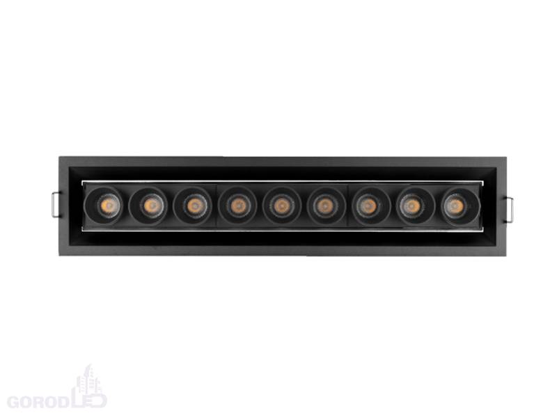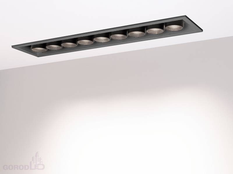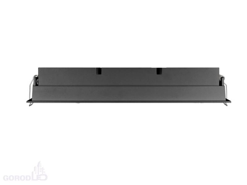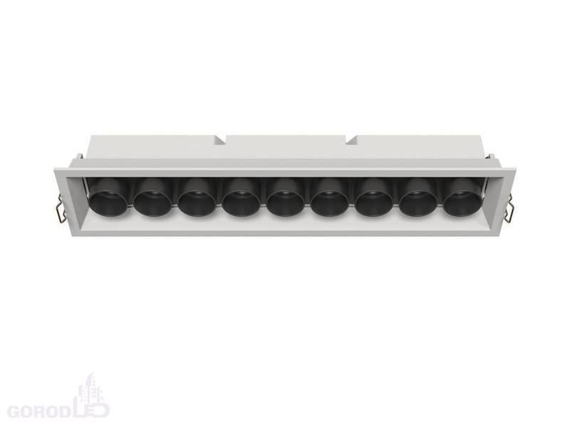 Встраиваемый светильник. Мощность 20 Вт, св. поток 1500 лм, 75 лм/Вт, Дневной белый 4000 K, Теплый белый 3000К, CRI>98, угол 30°, напряжение питания 230 В. Белый или черный прямоугольный корпус из алюминия, экран PMMA, степень защиты IP20. Размер: длина 300 мм, ширина 67 мм, высота 50 мм. Монтаж встраиваемый, установочное отверстие длина 295 мм, ширина 60 мм. Драйвер 17-29 В, 700 мА, пульсация <1%.