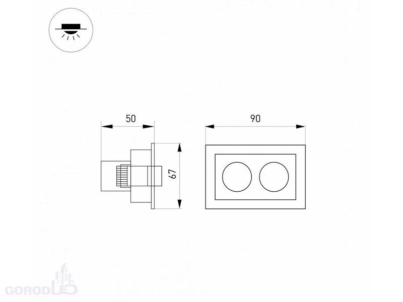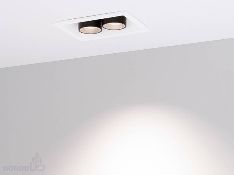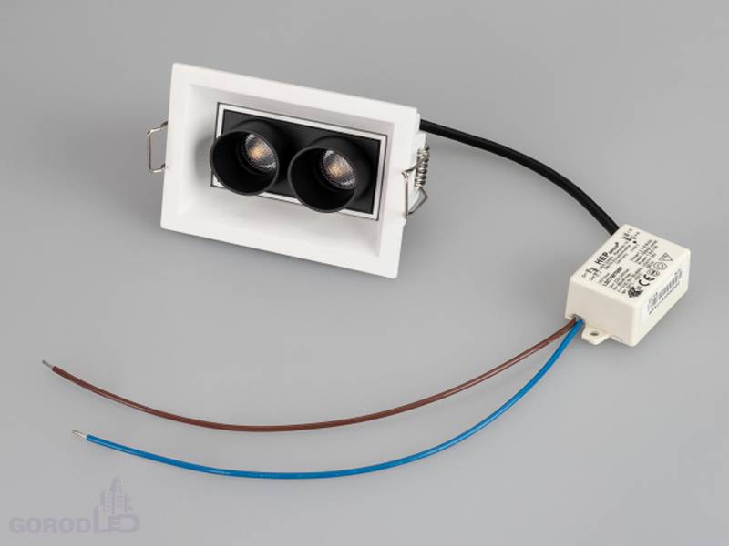 Встраиваемый светильник. Мощность 5 Вт, св. поток 375 лм, 75 лм/Вт, дневной белый 4000 K, теплый белый 3000К, CRI>98, угол 30°, напряжение питания 230 В. Белый или черный прямоугольный корпус из алюминия, экран PMMA, степень защиты IP20. Размер: длина 90 мм, ширина 67 мм, высота 50 мм. Монтаж встраиваемый, установочное отверстие длина 85 мм, ширина 60 мм. Драйвер 3-9 В, 700 мА, пульсация <1%.