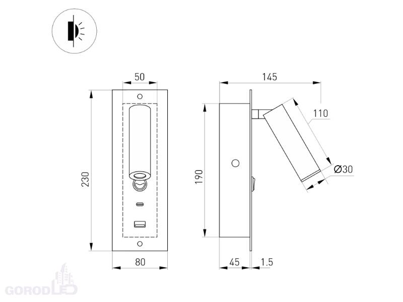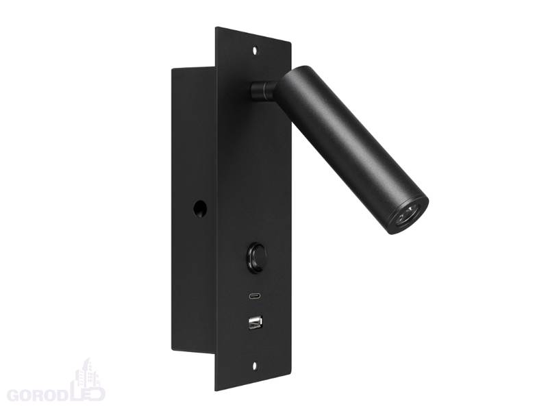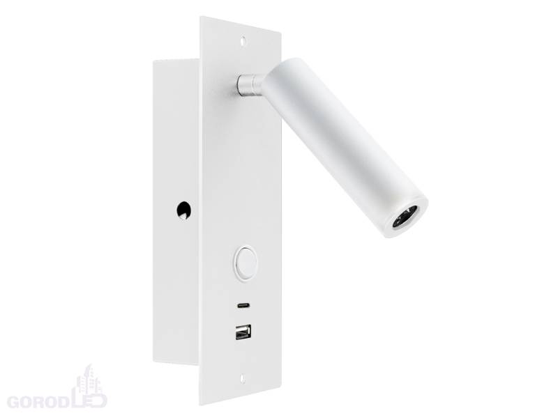 Встраиваемый настенный светильник. Мощность 3 Вт, св. поток 180 лм, 60 лм/Вт, теплый 3000 K, CRI>80, угол 20°, напряжение питания 230 В. Черный или белый прямоугольный корпус из алюминия, степень защиты IP20. Размер основания 80х230х1,5 мм. Размер светоизлучателя Ø30×110 мм. Монтаж встраиваемый, установочное отверстие: длина 190 мм, ширина 50 мм, глубина 46 мм. Драйвер встроенный 2,5-4,5 В, 700 мА, пульсация <5%. Встроенный USB порт для зарядки (стандартный и Type-C).