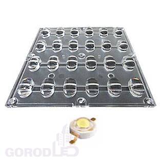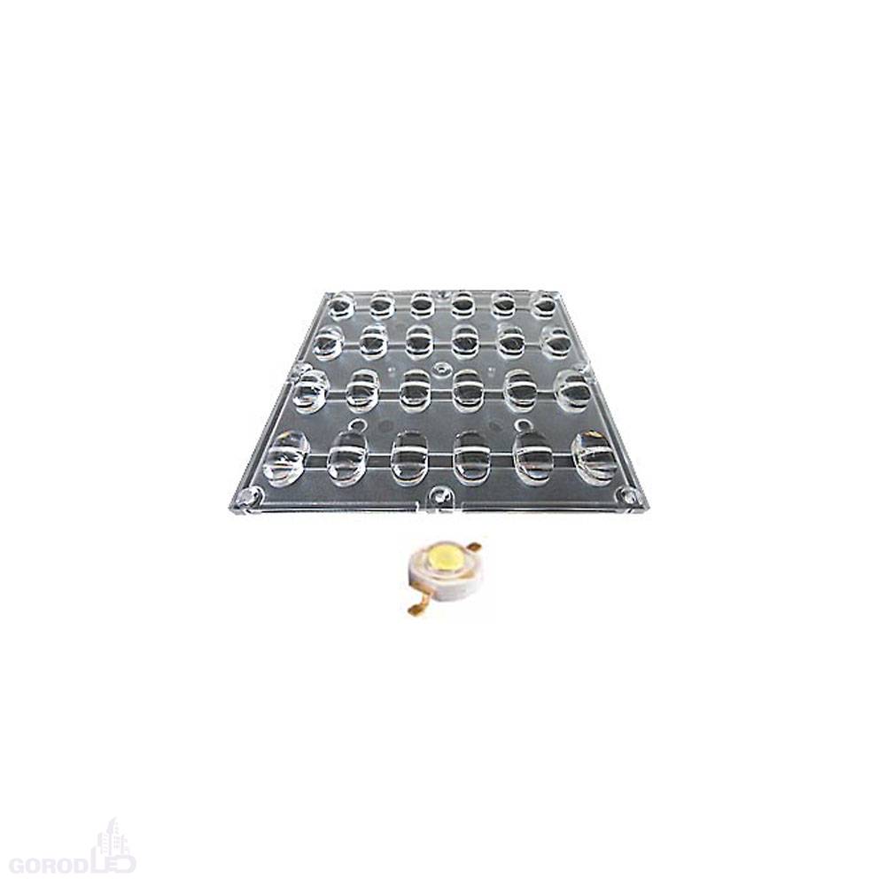 Блок линз 4х6 для светодиодов Emitter (24шт). Размер: 120x120 мм, H=10.2 мм. Угол: 120 x 40°. Используется с платой STB 012524, 012537, 120. Крепление под винт.