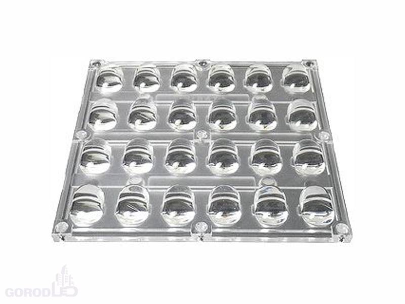 Блок линз 4х6 для светодиодов Emitter (24шт). Размер: 120x120 мм, H=10.2 мм. Угол: 130 x 60°. Используется с платой STB 24, 120. Крепление под винт.