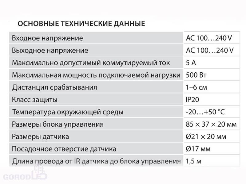 Бесконтактный ИК выключатель ламп и освещения 220В. Срабатывание от руки на расстоянии от 1 до 6 см, первый раз - ВКЛ, второй раз - ВЫКЛ. Максимальная мощность 500 Вт, AC100-240V. Размеры: блок 82 х 33 x 20 мм, датчик 20 x 20 мм, посадочное отверстие 18мм, кабель 1.5м.